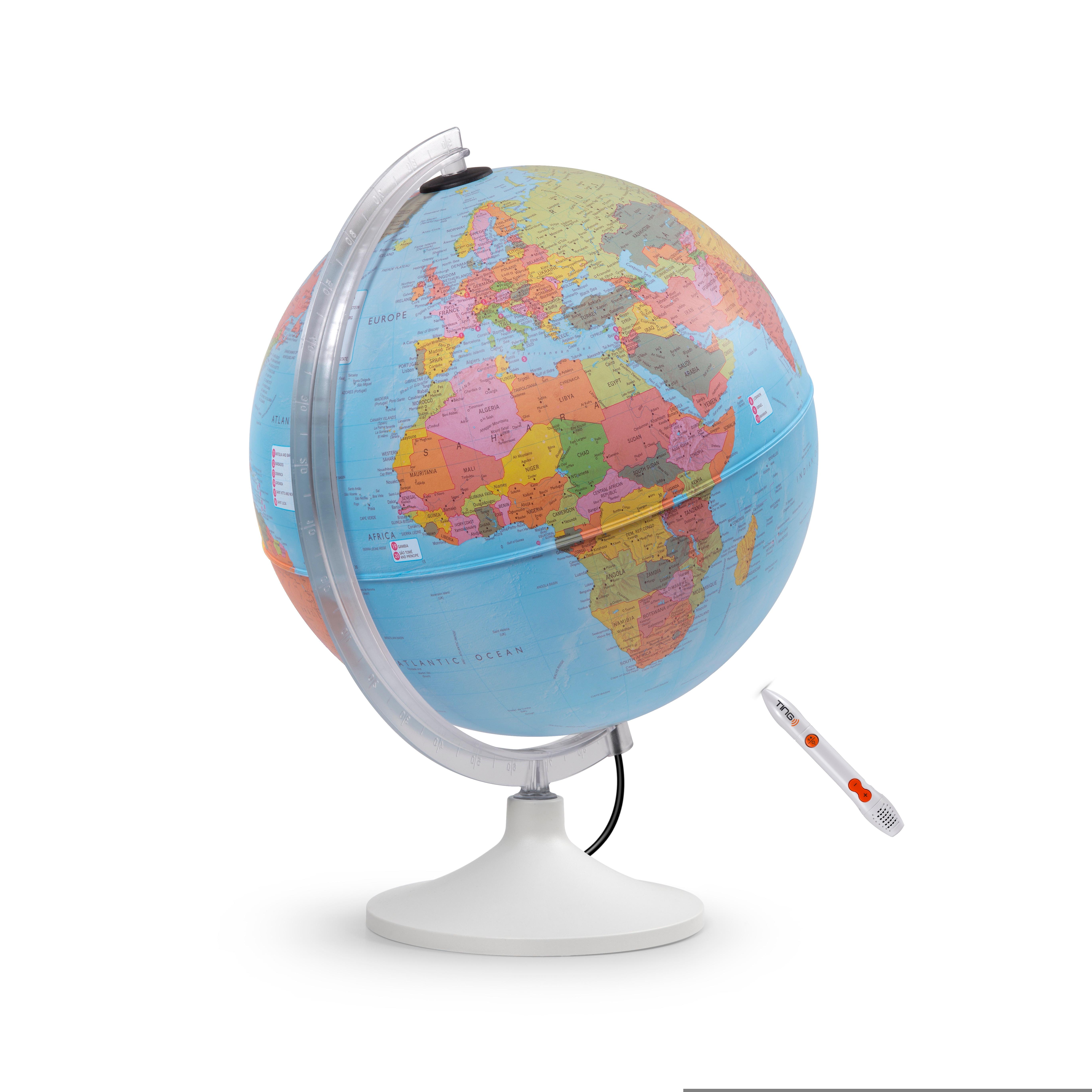 Parlamondo, Interaktiver Leuchtglobus mit Audio-Stift, 30 cm Durchmesser, beleuchtet, politische Kartografie, weißer stabiler Kunststofffuß, transparenter skalierter Meridian, Zuleitung ca. 1,50 m mit Schnurschalter, Lieferung inkl. Hörstift und USB-Kabel zum Laden. LED-Leuchtmittel.